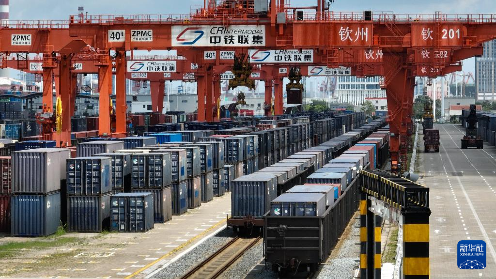 7月3日,一列满载集装箱的火车驶离钦州港东站(无人机照片)。