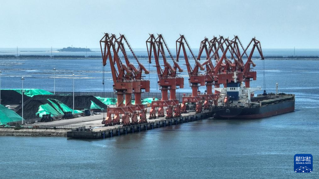 7月3日,一艘海轮停靠钦州港散货码头装卸货物(无人机照片)。