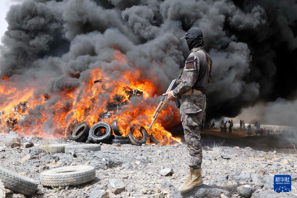 当日,也门胡塞武装在萨那销毁了约19吨包括大麻、冰毒在内的各类毒品。