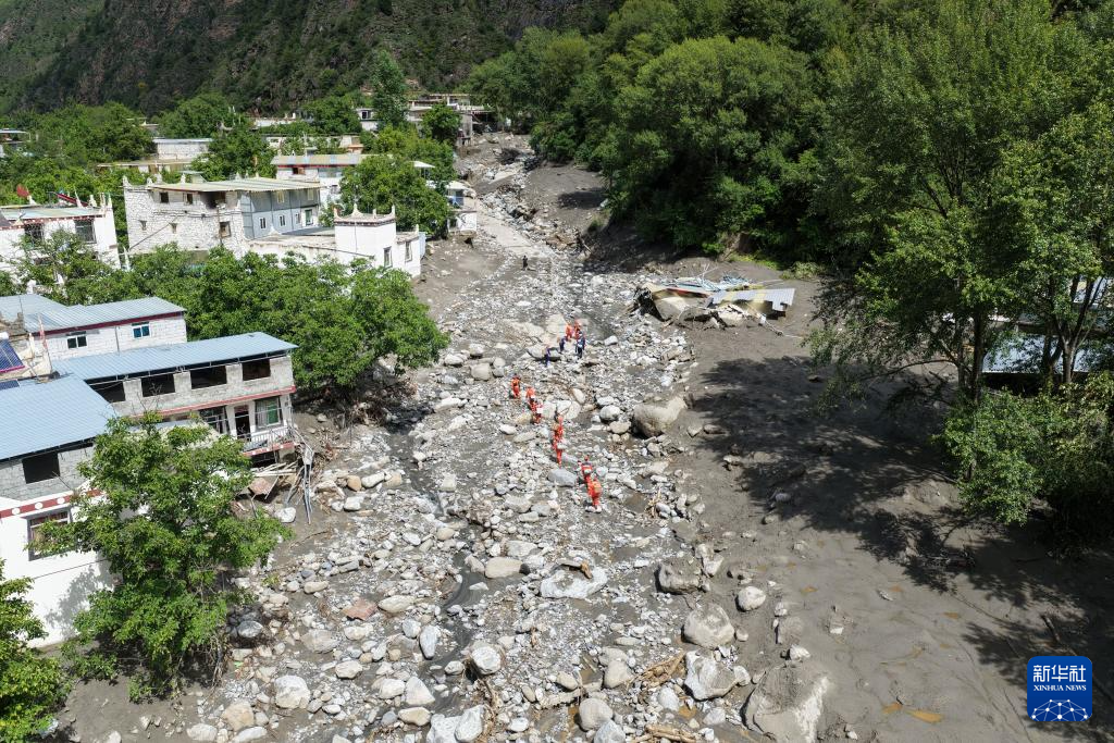 7月5日,在四川省甘孜藏族自治州丹巴县巴底镇沈足沟山洪泥石流现场,救援人员开展搜寻工作(无人机照片)。