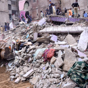 7月4日,在巴基斯坦南部港口城市卡拉奇,救援人员在住宅楼废墟中开展搜救工作。