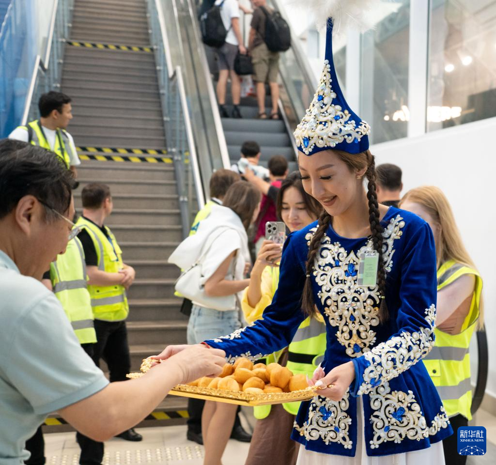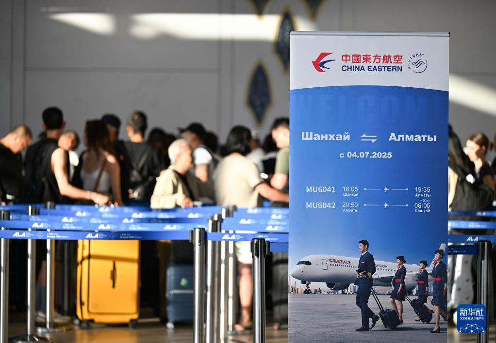 7月4日,在哈萨克斯坦阿拉木图国际机场,哈方工作人员欢迎中国东方航空公司上海至阿拉木图直飞航班旅客。