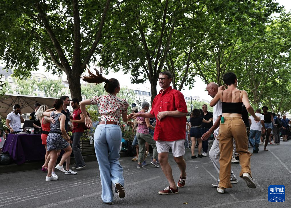 7月5日,人们在法国巴黎塞纳河边跳舞。