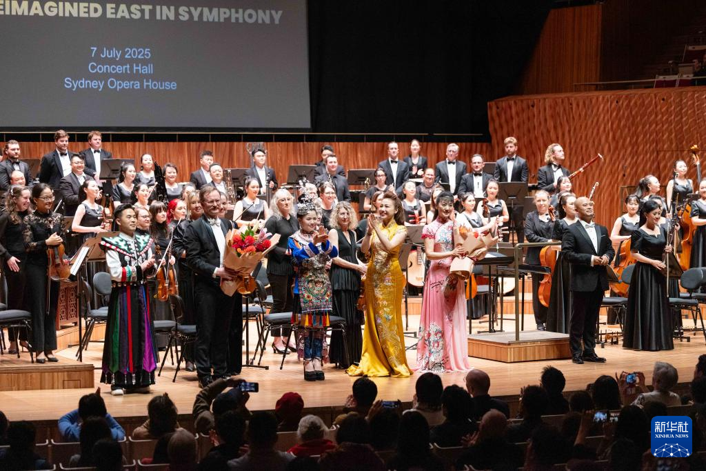 7月7日,在澳大利亚悉尼歌剧院,来自多彩贵州艺术团和澳大利亚管弦乐团的成员们在音乐会后谢幕。