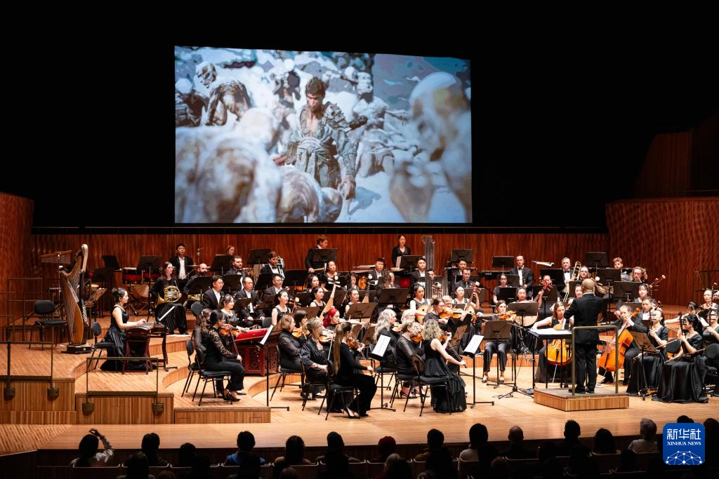 7月7日,在澳大利亚悉尼歌剧院,来自多彩贵州艺术团和澳大利亚管弦乐团的成员们在音乐会上演奏《悟空》。