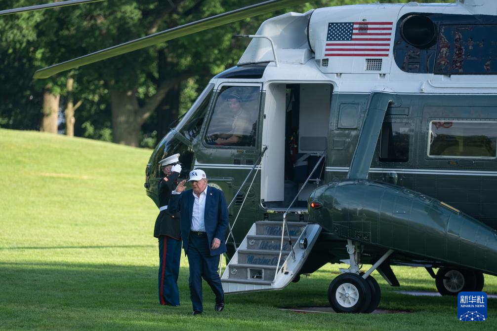 7月6日,美国总统特朗普乘直升机返回华盛顿白宫。