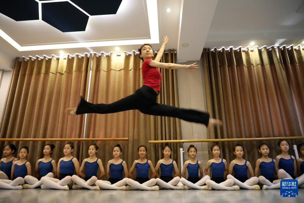 7月5日,在山东省滨州市博兴县一家舞蹈培训学校,一名老师为学生们示范舞蹈动作。