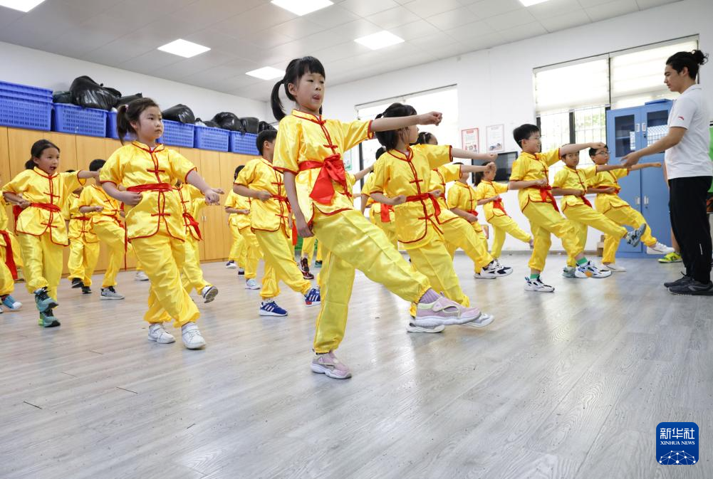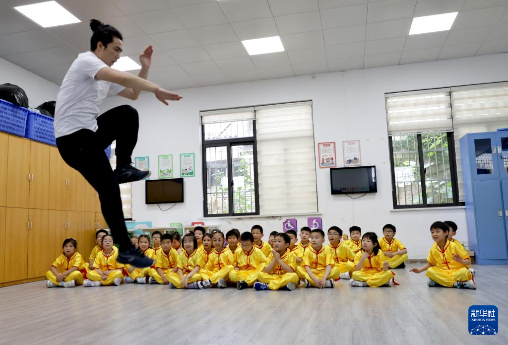7月7日,教练在上海黄浦区老西门街道的爱心暑托班上向小学员们展示武术动作。