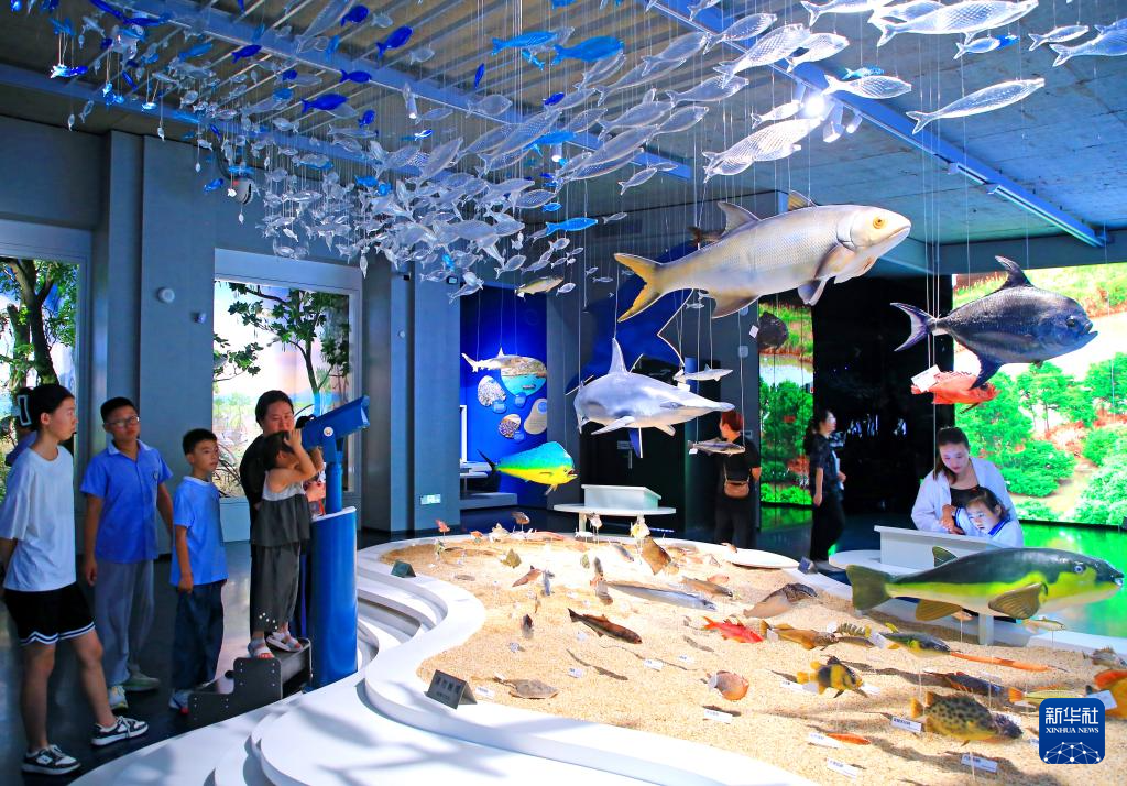 7月6日,家长带着孩子在位于浙江省玉环市的玉环博物馆参观游览。