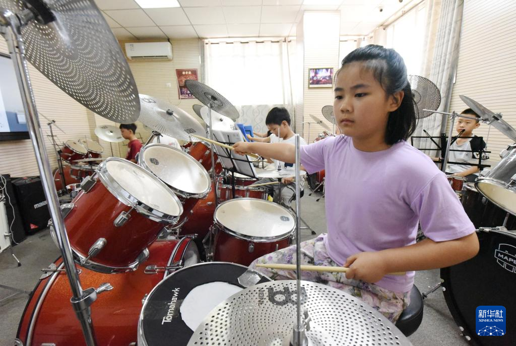 7月6日,孩子们在河北省石家庄市栾城区青少年活动中心学习架子鼓。