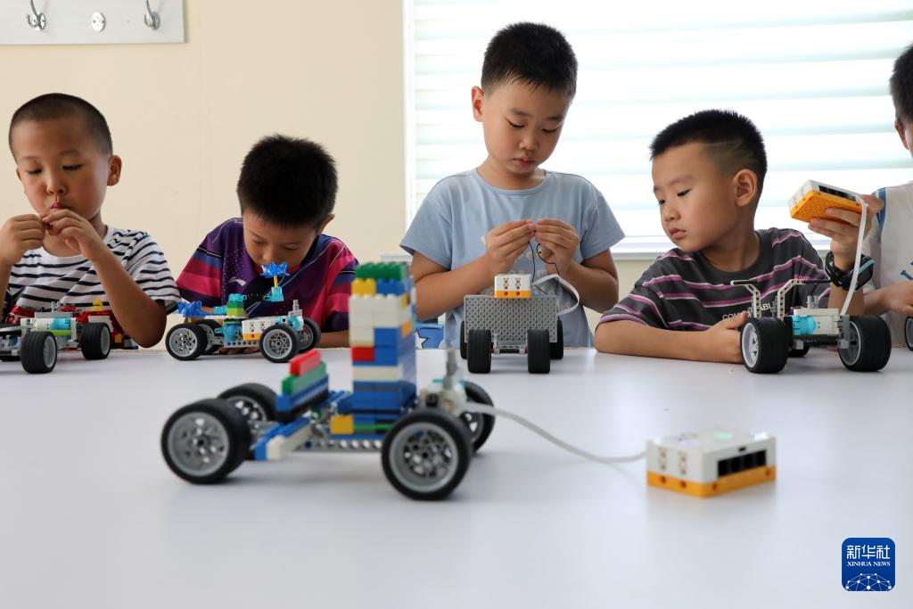 7月6日,小学生在山东省滨州市博兴县一家儿童机器人教育培训机构学习机器人编程。