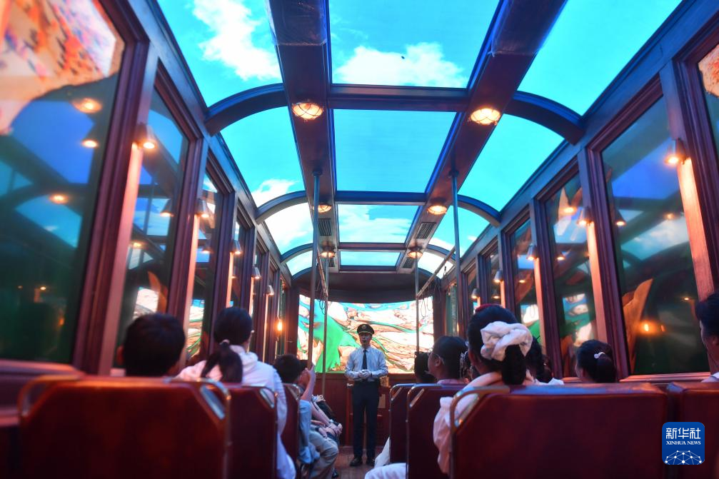 7月6日,小学生在位于山东省青岛市中山路的数字电车里听解说员介绍。