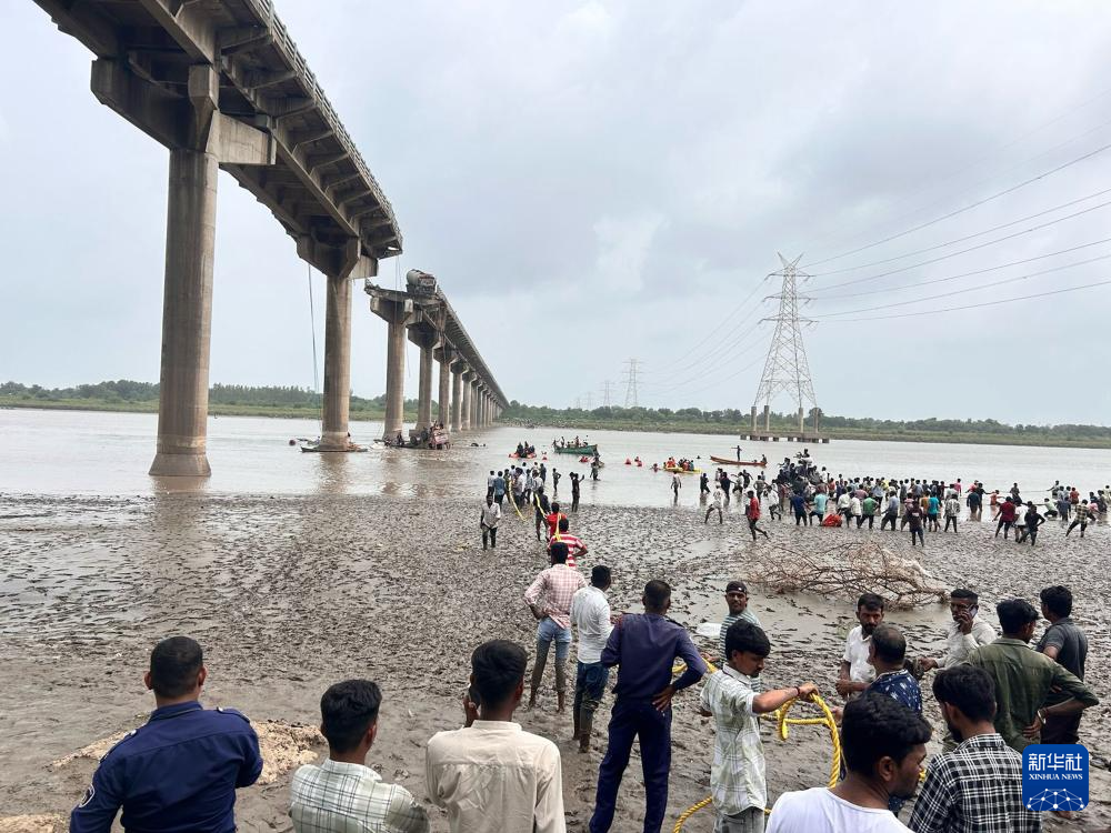 7月9日,救援人员在印度西部古吉拉特邦垮塌的桥梁旁开展救援行动。