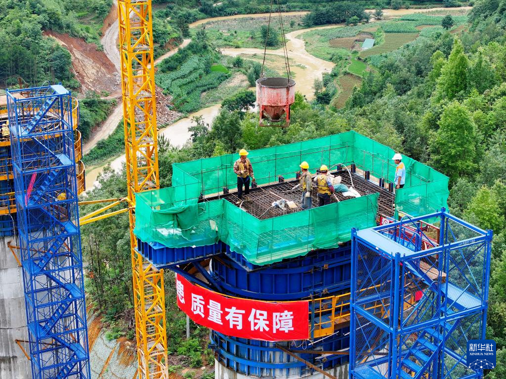 7月9日,工作人员对桥墩进行最后的混凝土浇筑(无人机照片)。