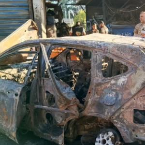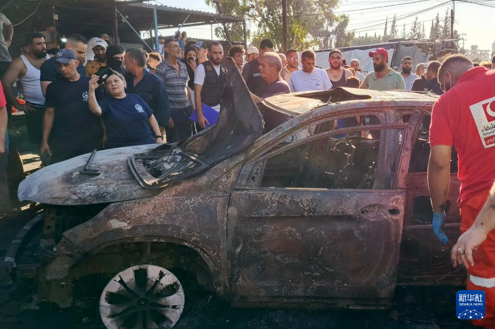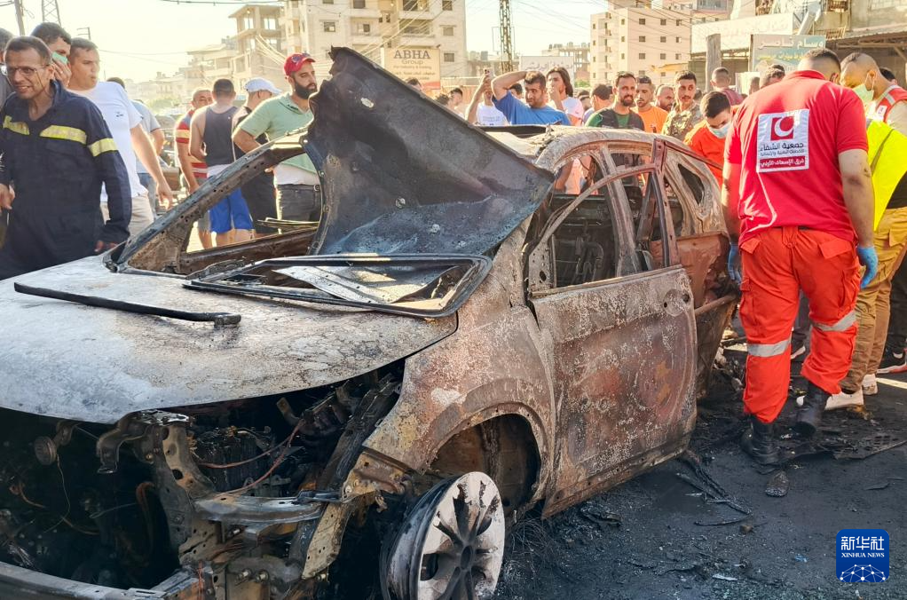 7月8日,人们在黎巴嫩北部城市的黎波里查看被以色列袭击的车辆(手机照片)。