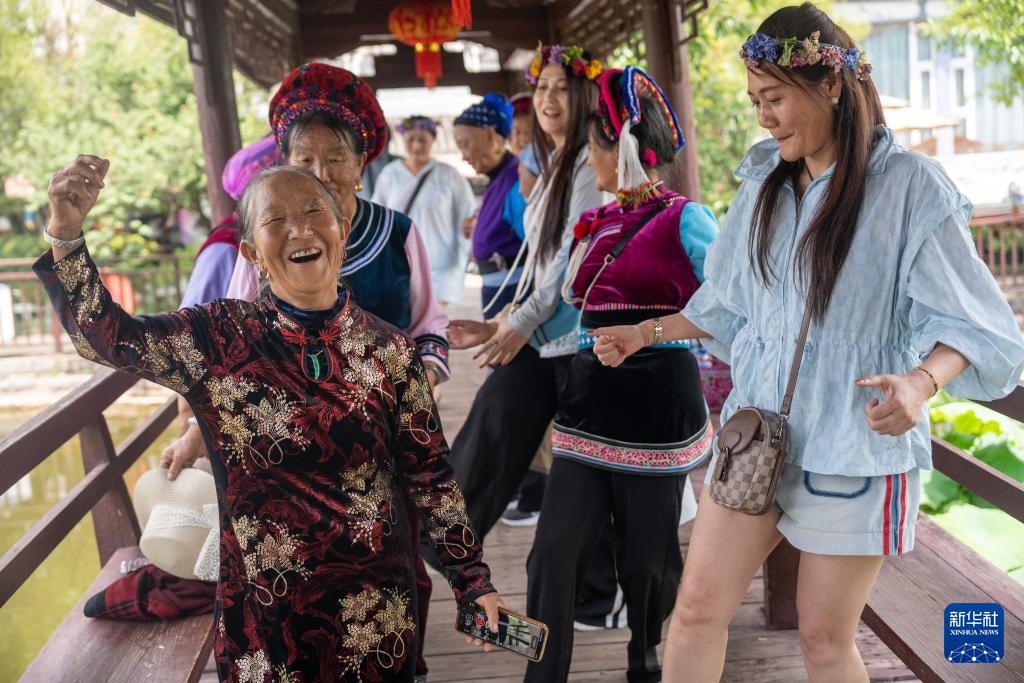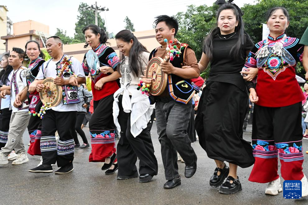 7月12日,游客在云南省文山壮族苗族自治州文山市新平社区庄子田村与当地村民一起体验弦子舞。