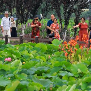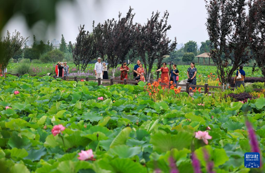 7月12日,游客在云南省曲靖市麒麟区沿江街道麒麟水乡赏景游玩。