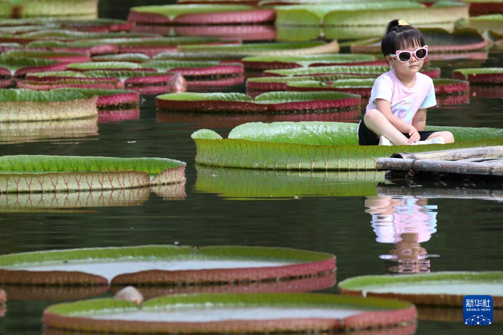 7月12日,小朋友在云南省勐腊县的中国科学院西双版纳热带植物园景区体验乘坐王莲。