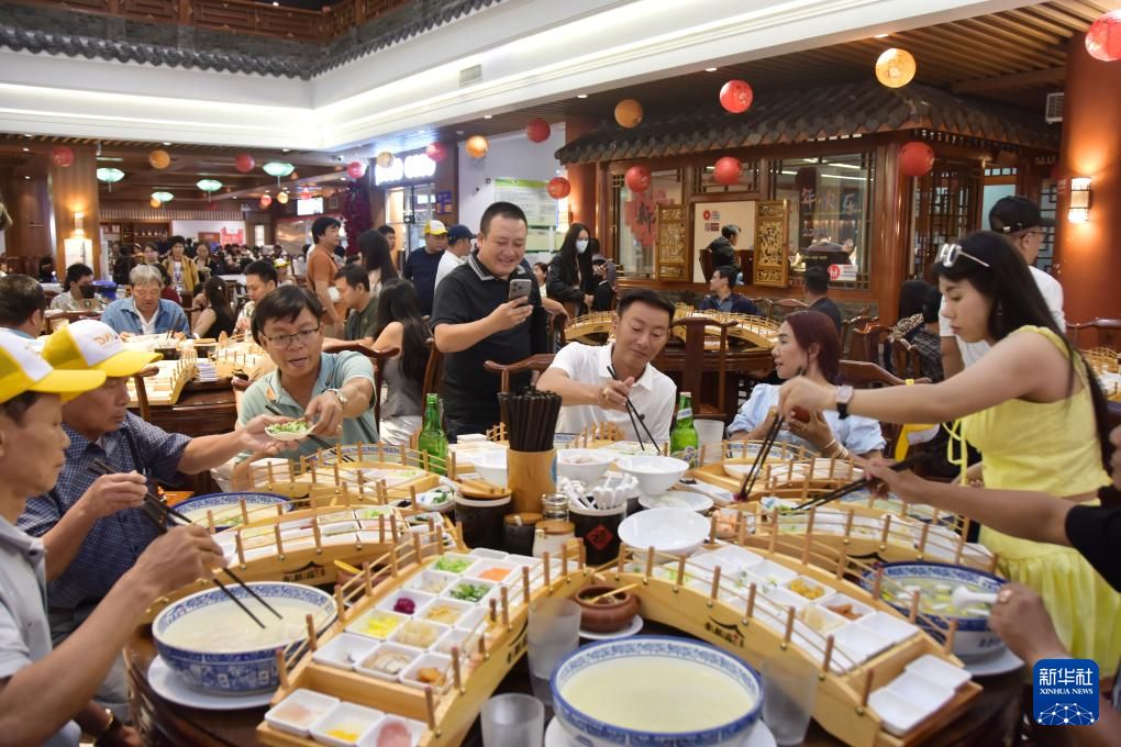 7月12日,来自越南的游客在云南省蒙自市一过桥米线店享用过桥米线。