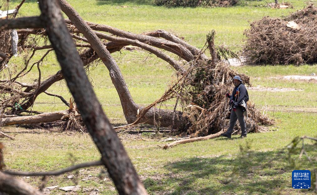 7月11日,在美国得克萨斯州亨特镇,一名男子走过洪灾中损坏的树木。