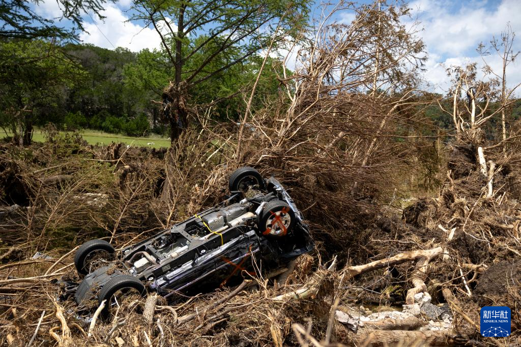 这是7月11日在美国得克萨斯州亨特镇拍摄的洪灾中受损的车辆。