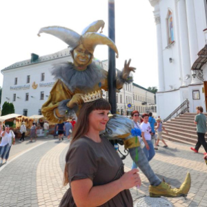 7月11日,演员在白俄罗斯北部城市维捷布斯克举行的“斯拉夫巴扎”国际艺术节上同游客互动。
