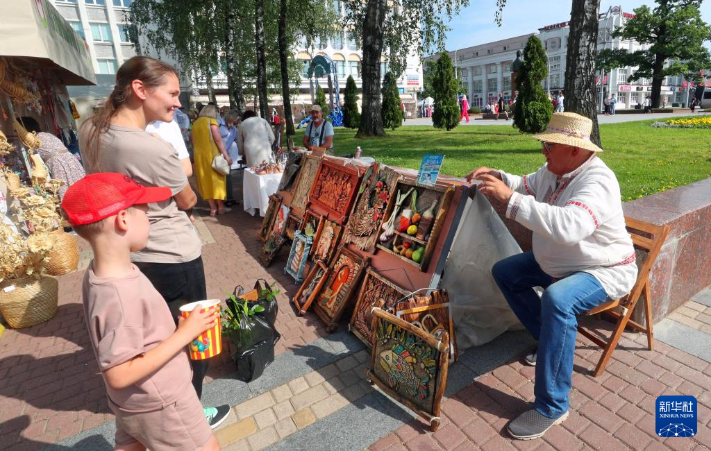 7月11日,游客在白俄罗斯北部城市维捷布斯克举行的“斯拉夫巴扎”国际艺术节上挑选手工艺术品。