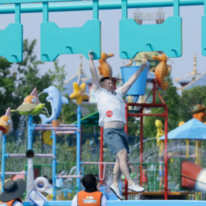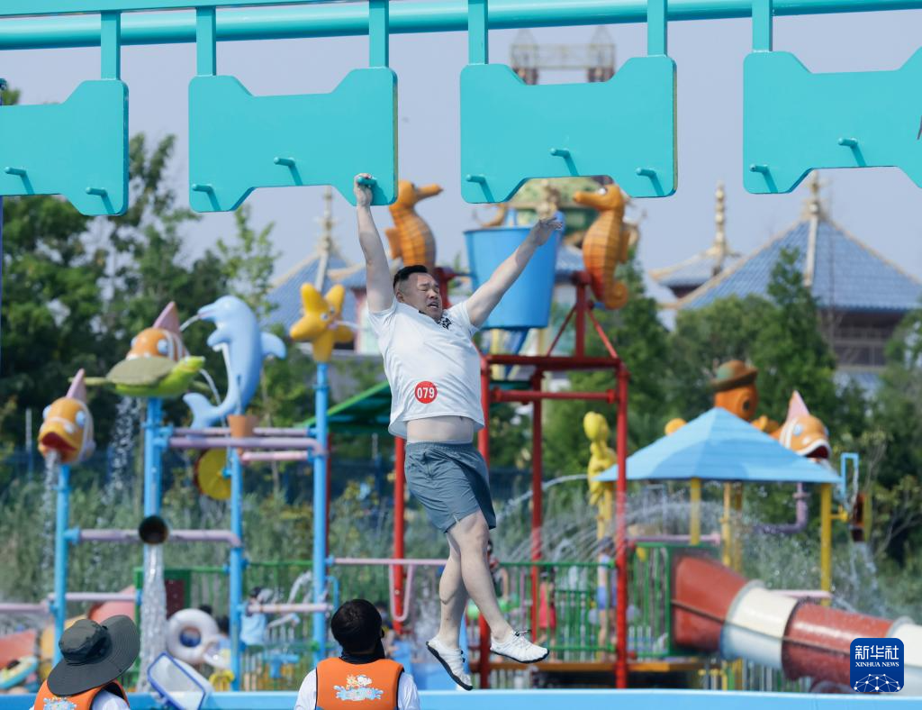 7月13日,游客在江苏淮安龙宫大白鲸水上乐园参加冲关游戏。