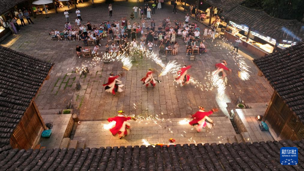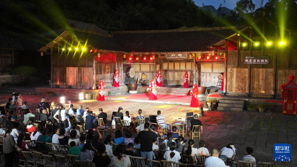 7月12日晚,游客在重庆市酉阳土家族苗族自治县桃花源景区观看演出《梦幻桃源》(无人机照片)。
