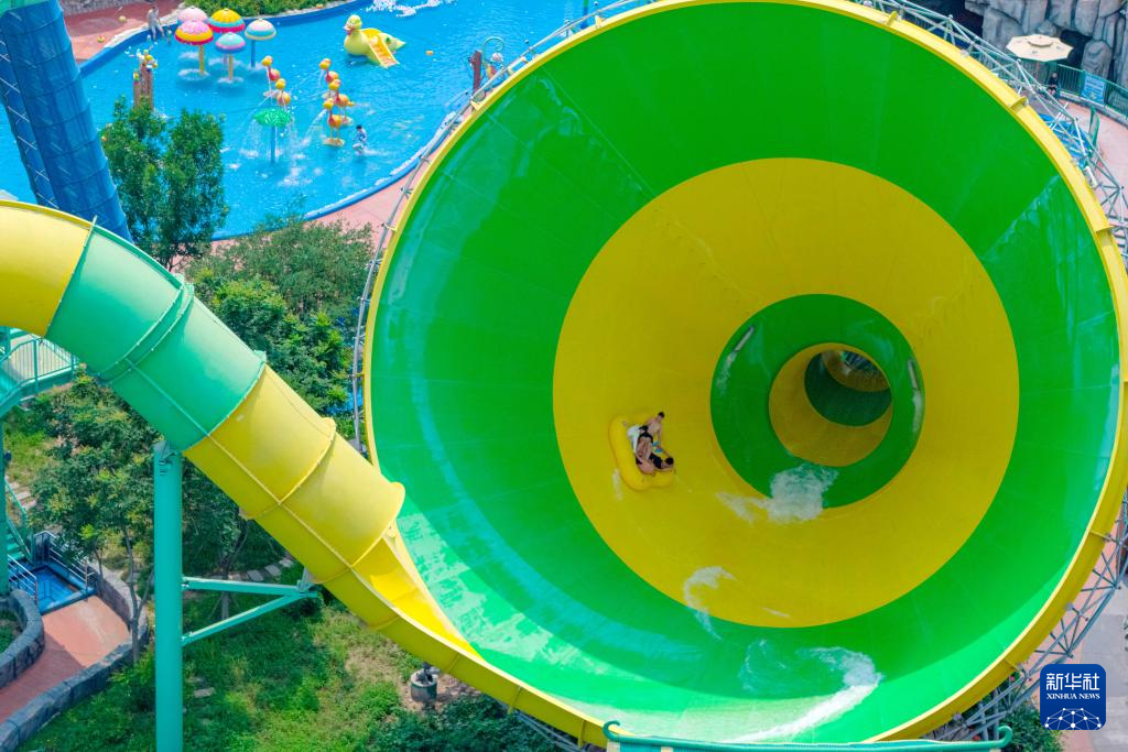 7月12日,小朋友在山东省枣庄市一家水上乐园戏水。