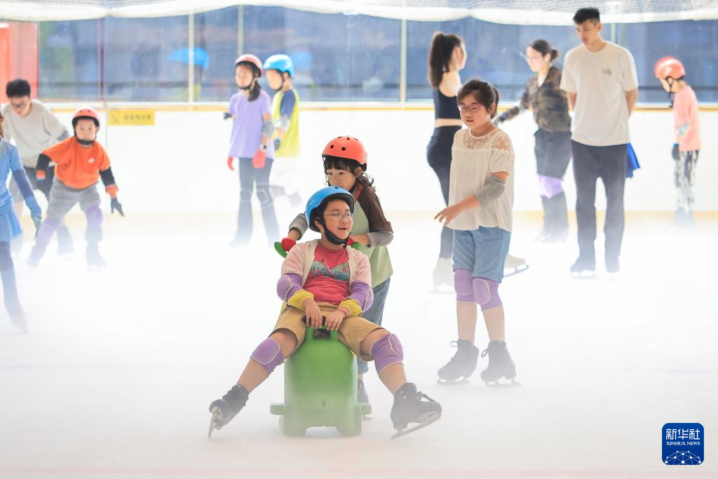 7月13日,小朋友在江苏南京一处室内滑冰场滑冰。