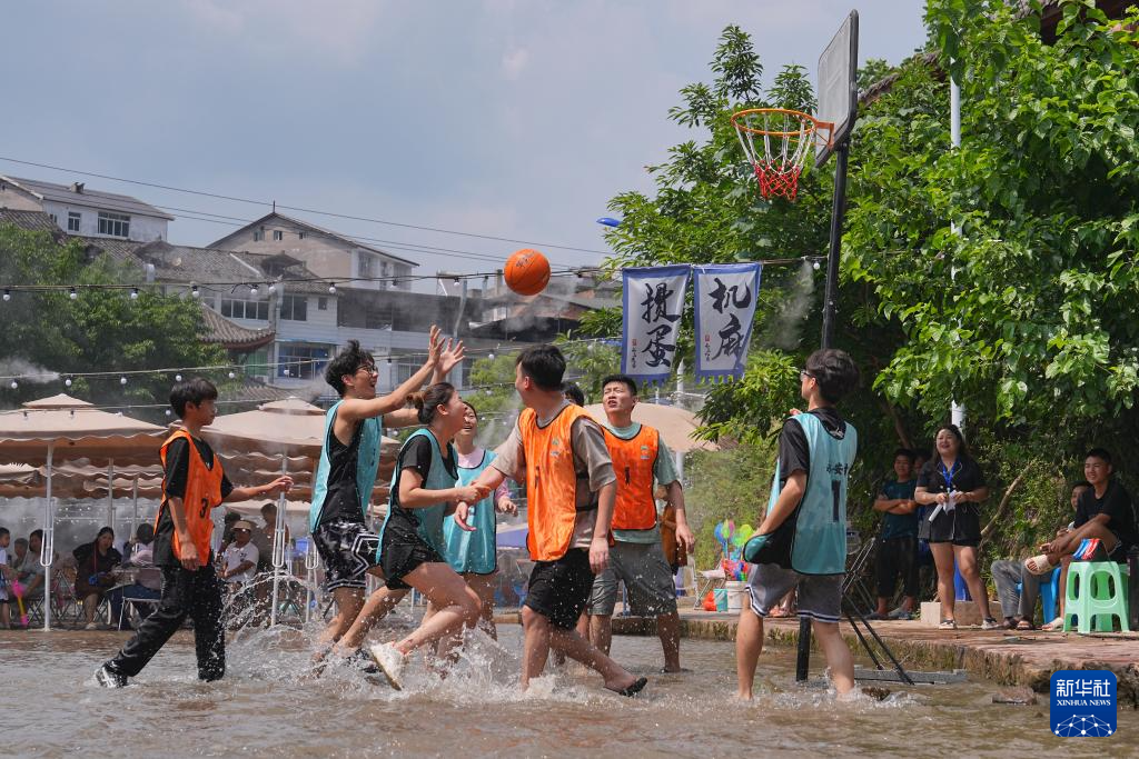 7月12日,在重庆市北碚区金刀峡镇偏岩古镇,村民参加水上趣味篮球比赛。