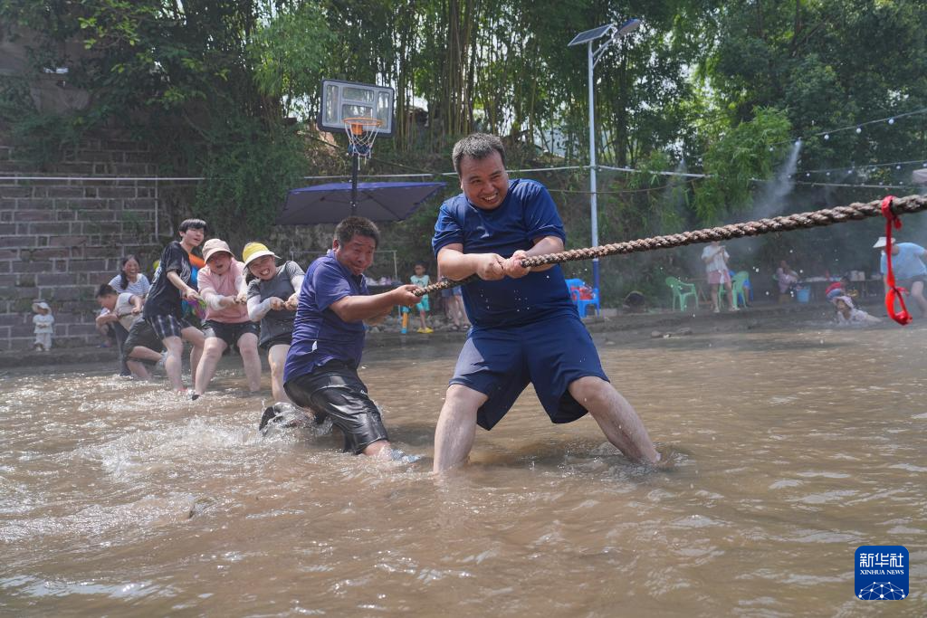 7月12日,在重庆市北碚区金刀峡镇偏岩古镇,村民参加趣味拔河比赛。
