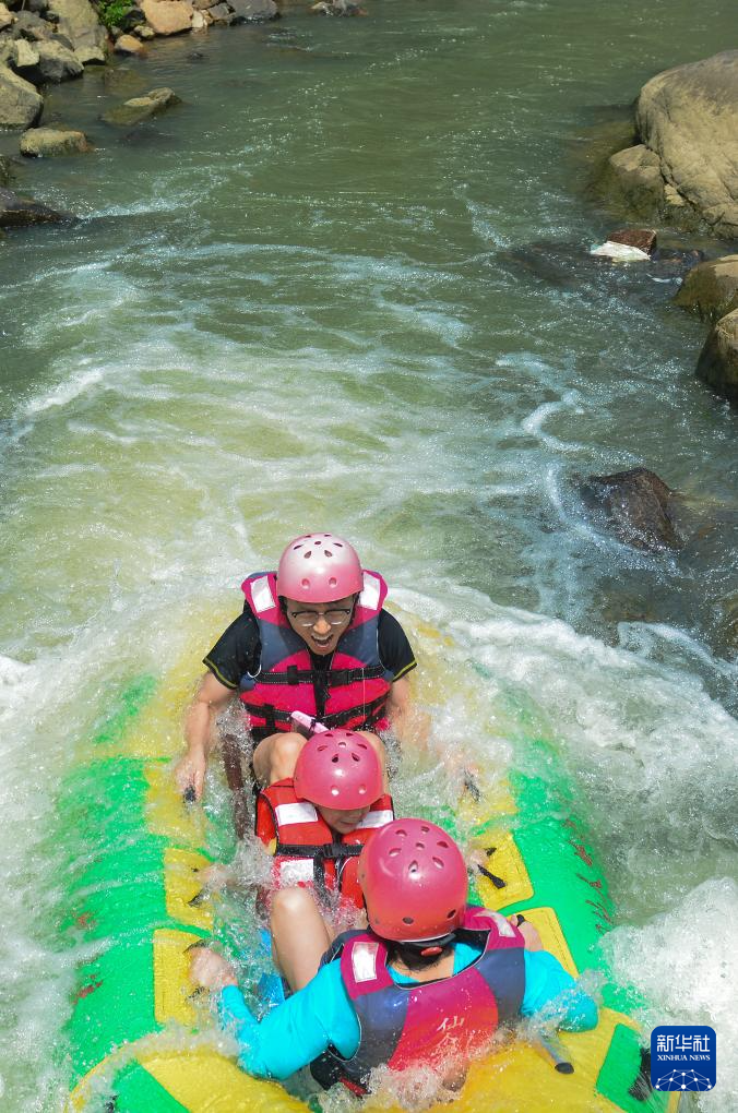7月12日,游客在浙江省三门县珠岙镇仙人峡漂流。