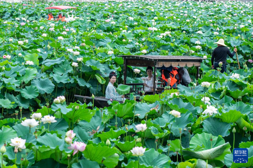 7月12日,游客在湖南省娄底市娄星区青山公园泛舟赏荷。