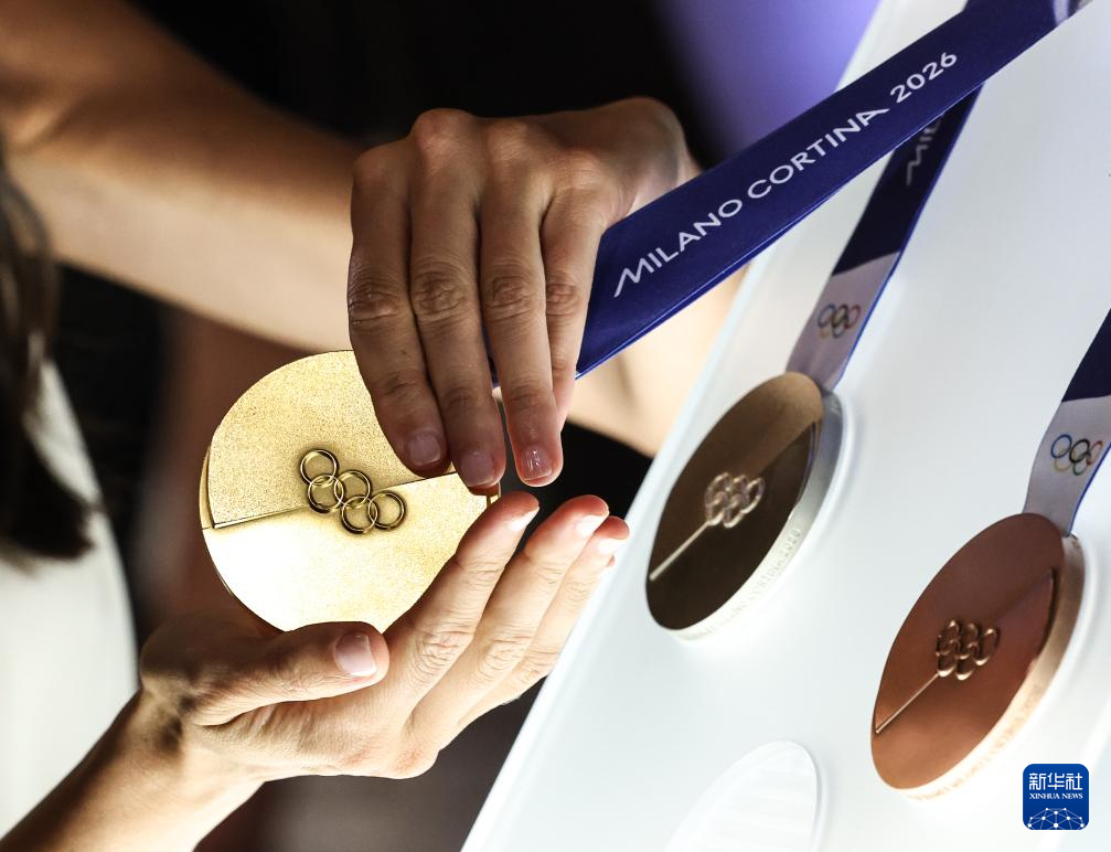 这是发布活动现场拍摄的2026年米兰-科尔蒂纳冬奥会和冬残奥会奖牌。