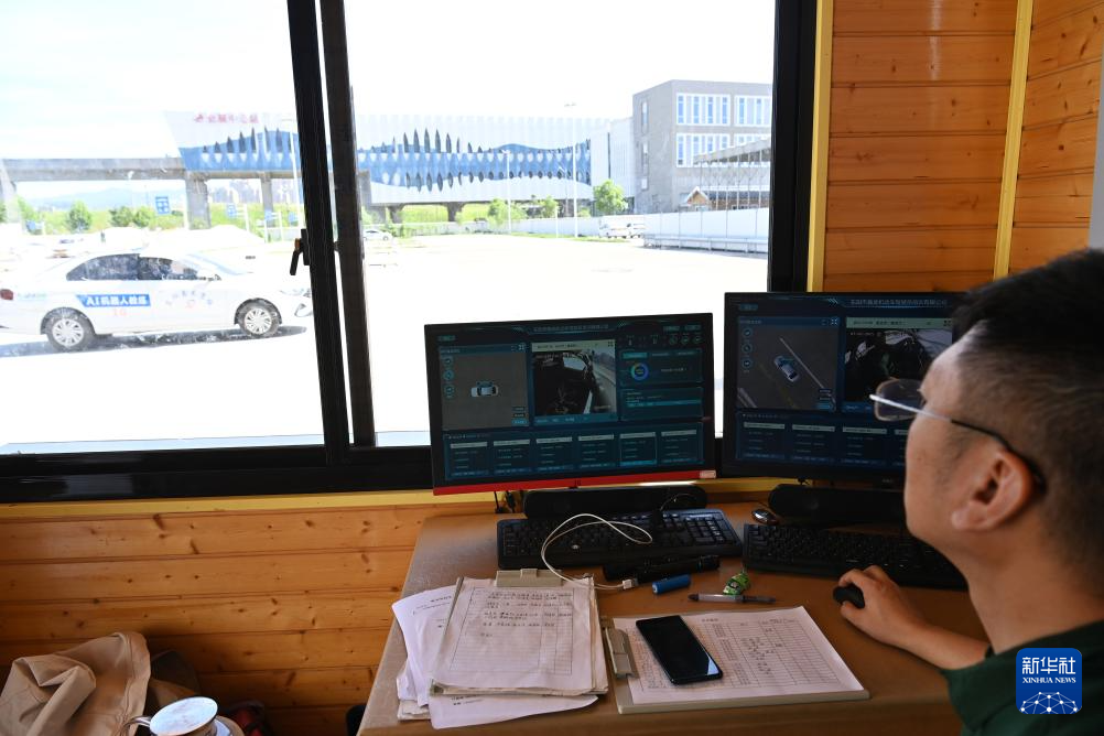 7月2日,驾校教练通过实时监控关注AI智能教练车行驶情况,并可随时与学员语音交流。