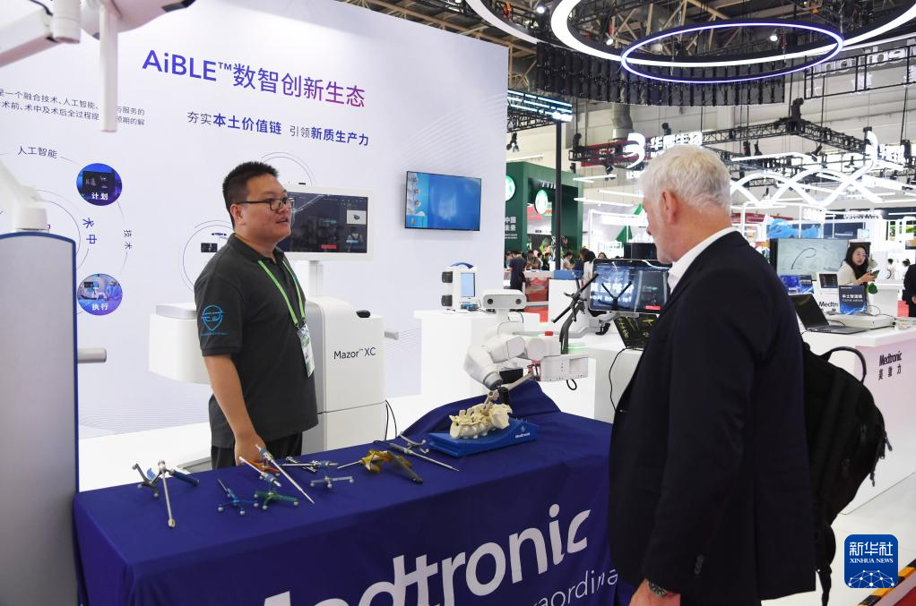 7月16日,工作人员(左)在健康生活链展区为观众介绍一款骨科手术机器人。