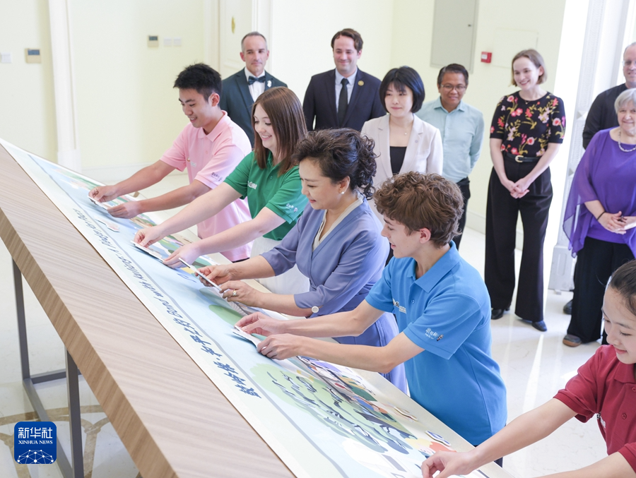 7月17日下午,国家主席习近平夫人彭丽媛在全国对外友协出席2025年“鼓岭缘”中美青少年联谊活动并致辞。这是联谊活动前,彭丽媛会见穆言灵和贝隆。