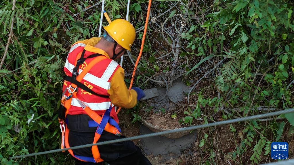 桥隧工人巡查隧道顶部的被动网(7月15日摄,无人机照片)。