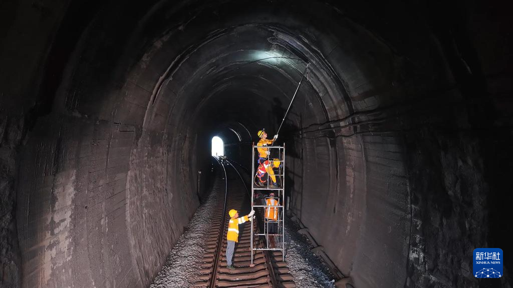 桥隧工人检查隧道内铁轨(7月16日摄)。