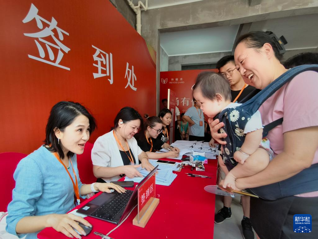 7月17日,在浙江省宁波市首个共有产权住房项目和樾湾交付现场,一名家长抱着孩子签到办理入住手续。