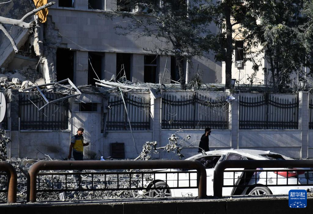 7月16日,在叙利亚首都大马士革,行人经过在以色列空袭中受损的叙“总参谋部”大楼。