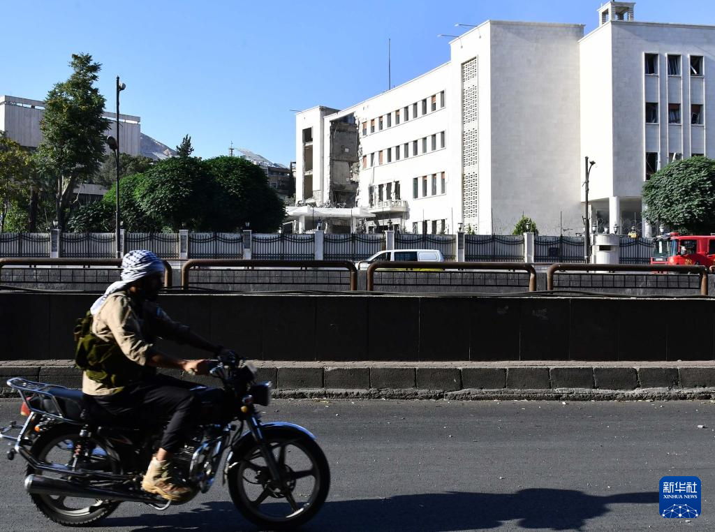 7月16日,在叙利亚首都大马士革,一名男子骑摩托车经过在以色列空袭中受损的叙“总参谋部”大楼。