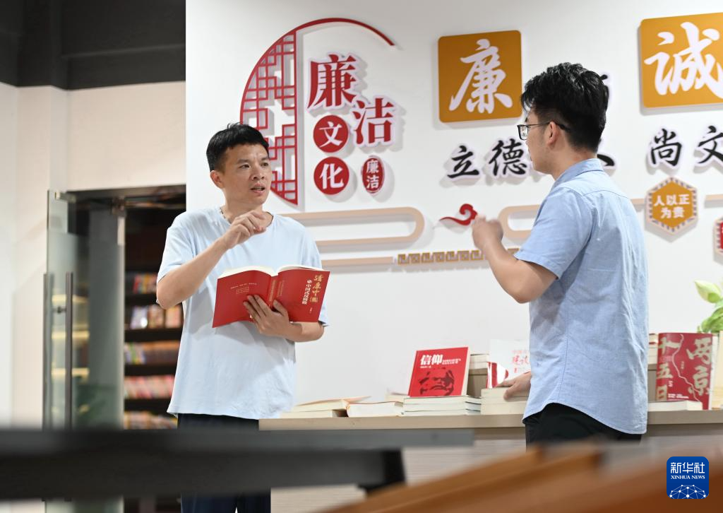 7月17日,胡廷枫(左)在屏南县新华书店与书店工作人员洽谈购买社工读物事宜。