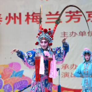 7月17日,泰州梅兰芳京剧团的演员演出京剧名段《扈家庄》。