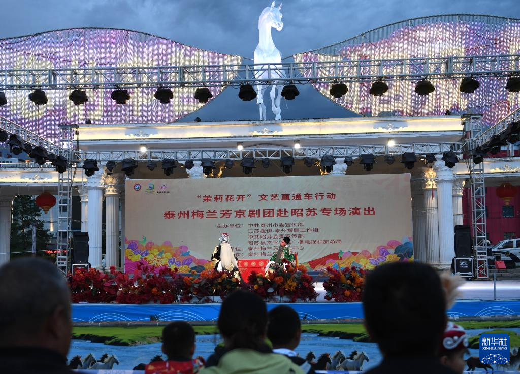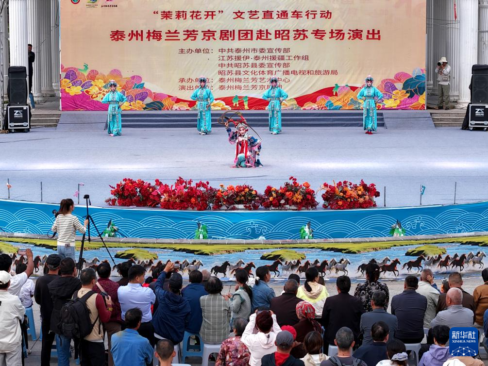 当日,在新疆昭苏县乌孙广场,江苏泰州梅兰芳京剧团“茉莉花开”文艺直通车为当地群众带来经典折子戏专场演出,上演《扈家庄》《将相和》等京剧名段。此次演出是泰州市推进文化润疆的具体实践,通过“送戏进疆”促进两地文化交流,展现了“泰昭一家亲,共谱同心曲”的深厚情谊。