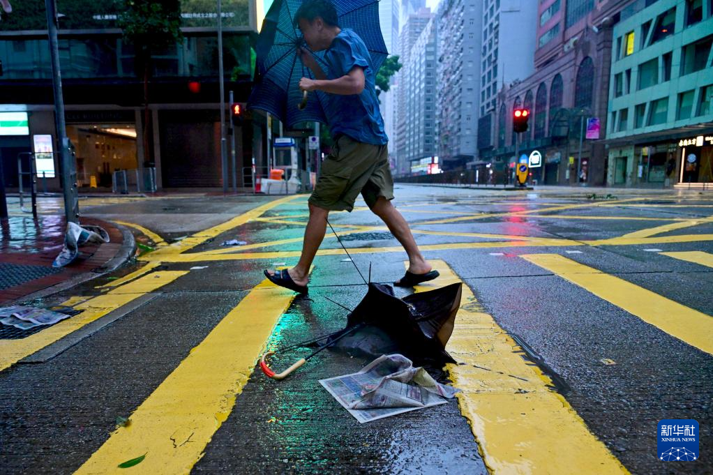 7月20日,行人从香港街头被吹坏的雨伞旁走过。