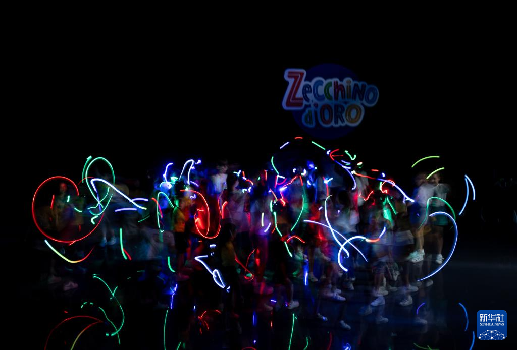 7月18日,在意大利博洛尼亚,绣球花小合唱团团员陆宸(中)与安东尼亚诺小合唱团团员埃利亚·鲁比尼在一起玩耍。