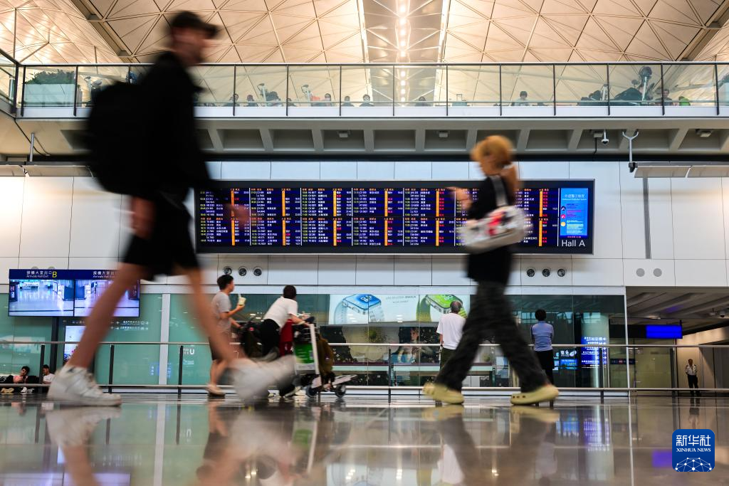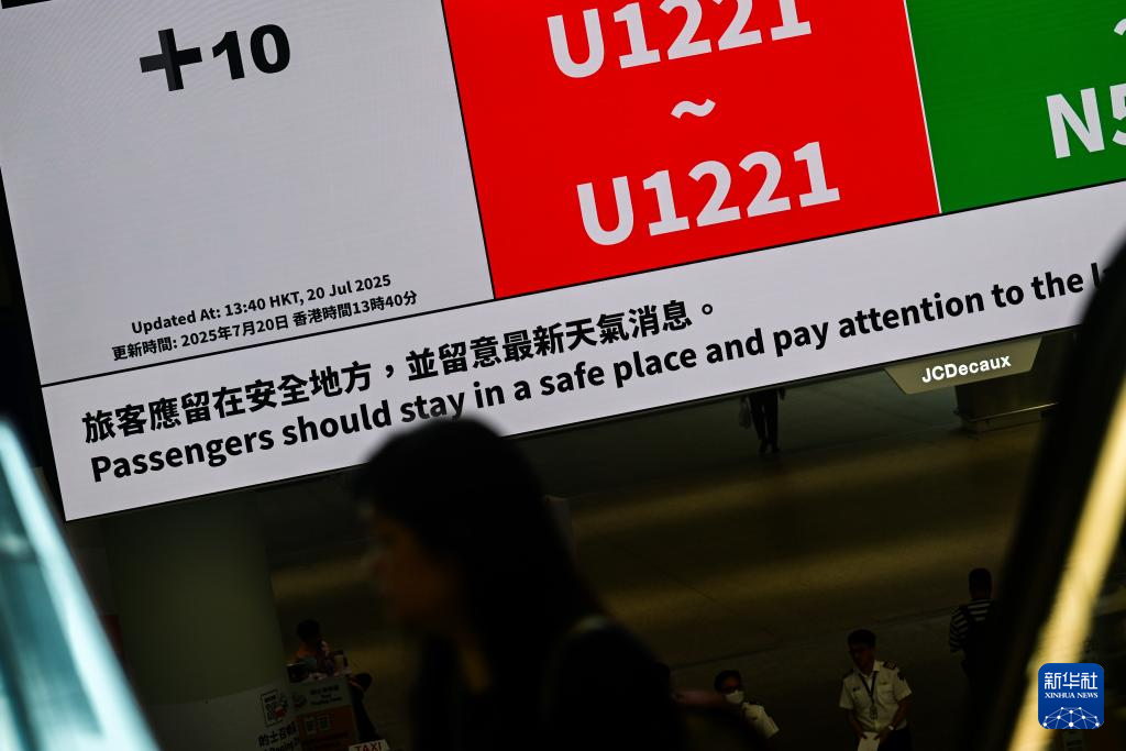 7月20日,旅客从香港国际机场的航班信息显示屏前走过。